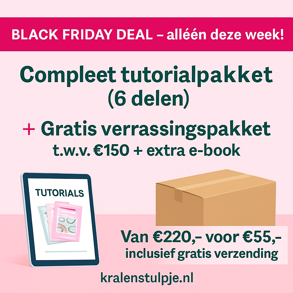 Bij dit digitale pakket hoort een gratis verrassingspakket t.w.v. €150,- met willekeurige kralen, bedels en sieradenonderdelen. Dit pakket krijgt u alleen gratis bij aanschaf van het complete tutorial pakket.